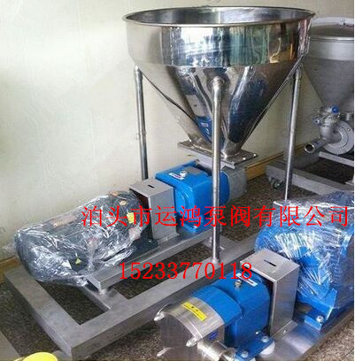 在销售中我们经常会遇到很多客户工况中输送很稠的介质,比如说肉泥,豆瓣酱,黄豆酱,绿豆砂,巧克力等流动性很慢的介质,这种介质在输送时泵很难抽进泵腔,只能把介质倒流,倒进泵腔。那我们就根据客户的需求,在凸轮转子泵泵的进口处改为方形进料口,在进料口安装料斗,这样介质就可以自流到泵腔里,然后在通过泵打到灌装机内。这样既省去了很多人力,提高了灌装效率。